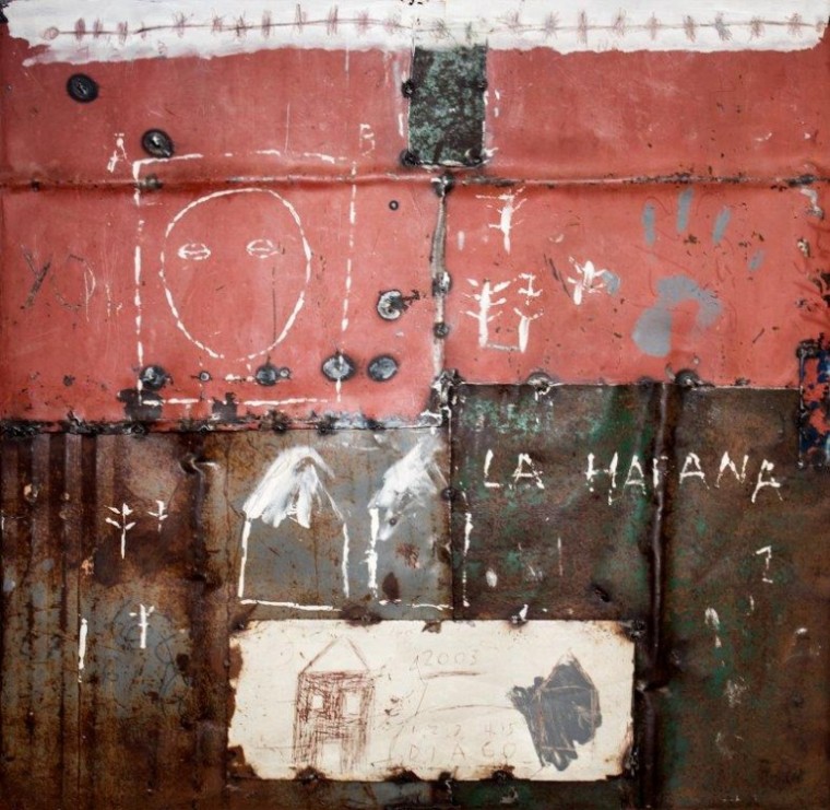 Al lado del maestro (su abuelo), el aventajado alumno lleva en sus genes el arte. Juan Roberto Diago nos vuelve a enseñar sus sólidas creaciones: ese sistema iconográfico personal cuajado de signos-símbolos que dibujan lo cubano, donde pone en juego motivos y situaciones del lenguaje cotidiano para decir en el arte. Técnicas mixtas sobre diversas “pieles”: lienzo, metal, madera y cartulina regala el joven Diago en esta exposición donde se mueven pinturas, dibujos e instalaciones en los que emergen, entre texturas, tintes de sugerente misterio, dado por los tonos que se mueven entre el negro y los ocres, con algún que otro matiz. En sus superficies, generalmente rugosas, pasean sus signos repletos de metáforas y realidades.